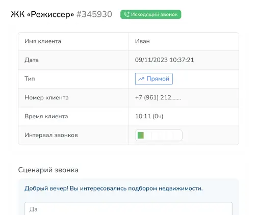 Первый звонок — через 10 секунд после заявки. Система сама дозванивается и ставит вызовы в очередь, включая отложенные по просьбе клиента.