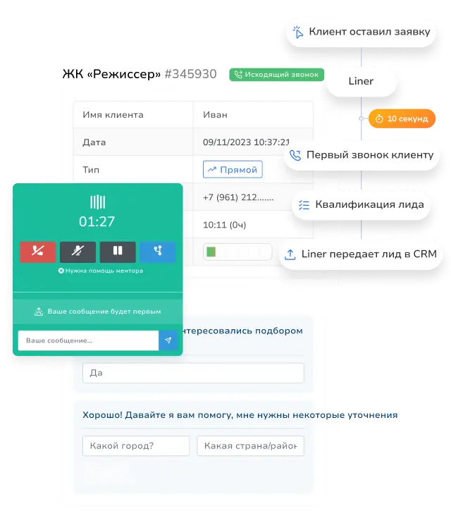 Лайнер передаёт в CRM лида с полной историей взаимодействий: звонки, переписки, ключевые ответы. Если нужно подключить менеджера, соединяет прямо во время разговора — без повторных звонков и пауз.